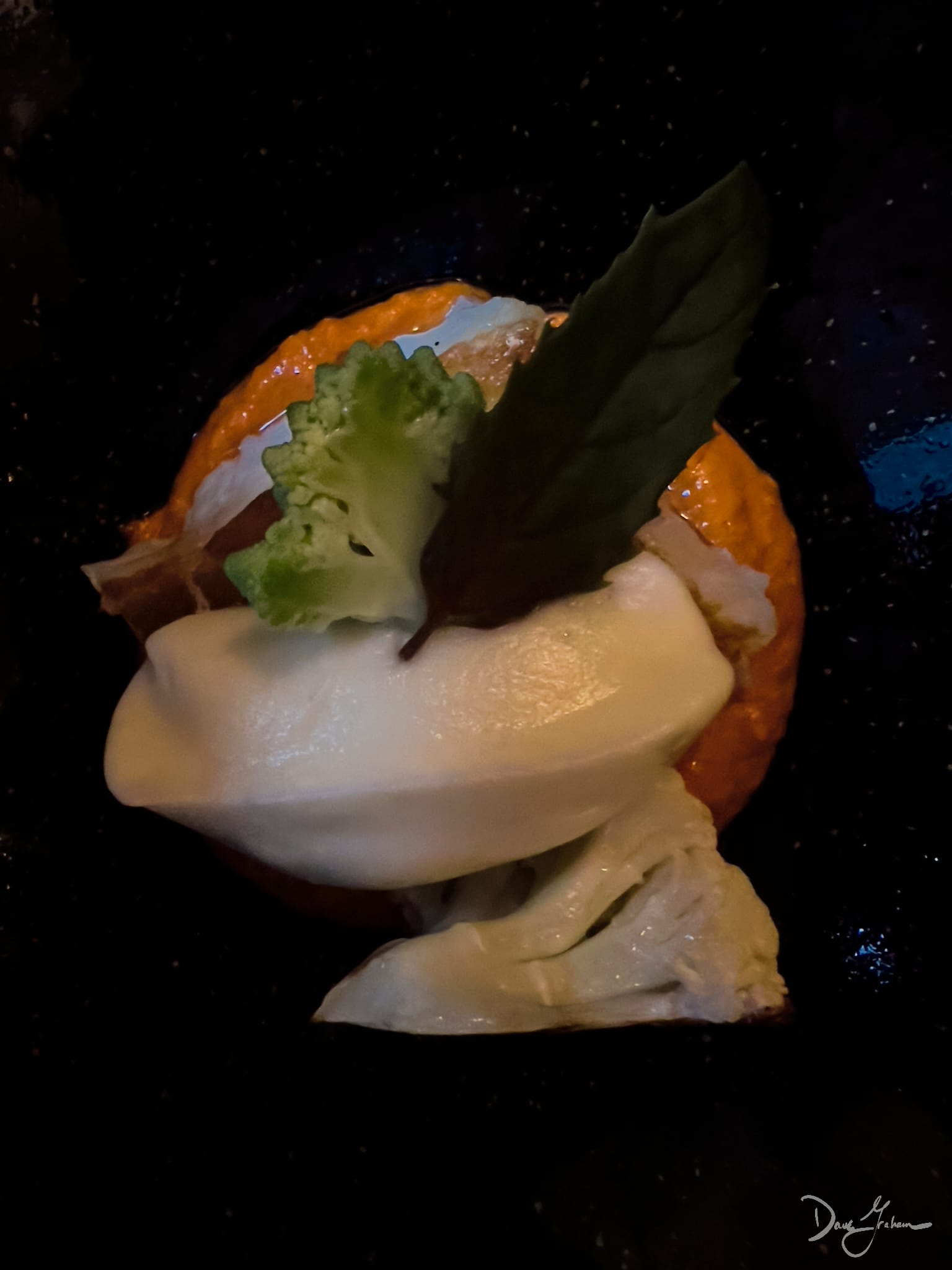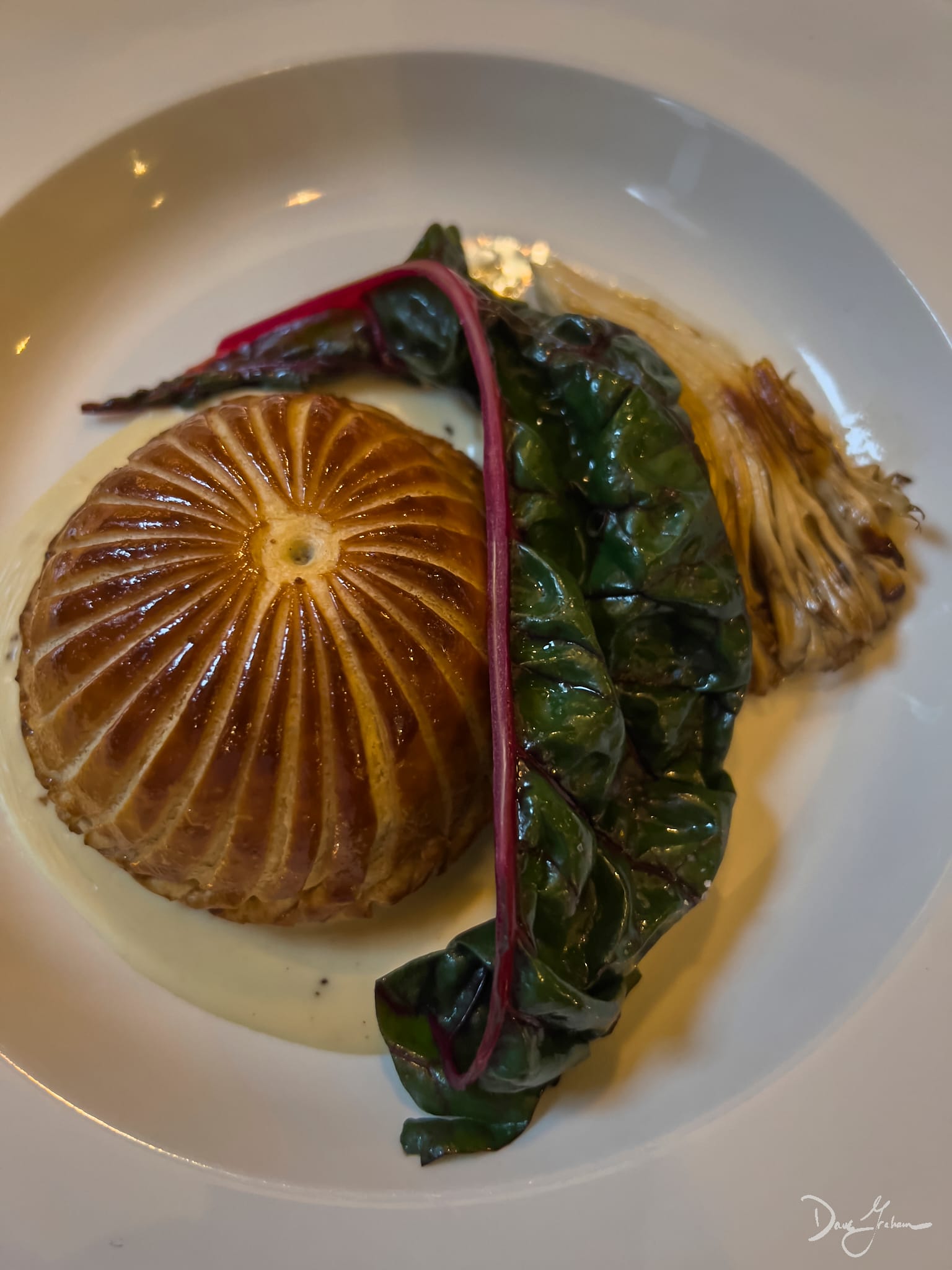Wrapped within the careful layers of this pithivier lies a delicate simplicity for our palates. The careful administration of egg wash and heat darkens the shell that contains a vibrant core of mushroom and veg, a steaming cacophony of flavour and texture unexpected from the order outside its flaky walls. Draped to one side, the rich purplish-reds of hothouse kale, folded and wrinkled, delicate yet strong, offset the tendrils of yet another mushroom, all cradled in a heady mix of fior di latte.