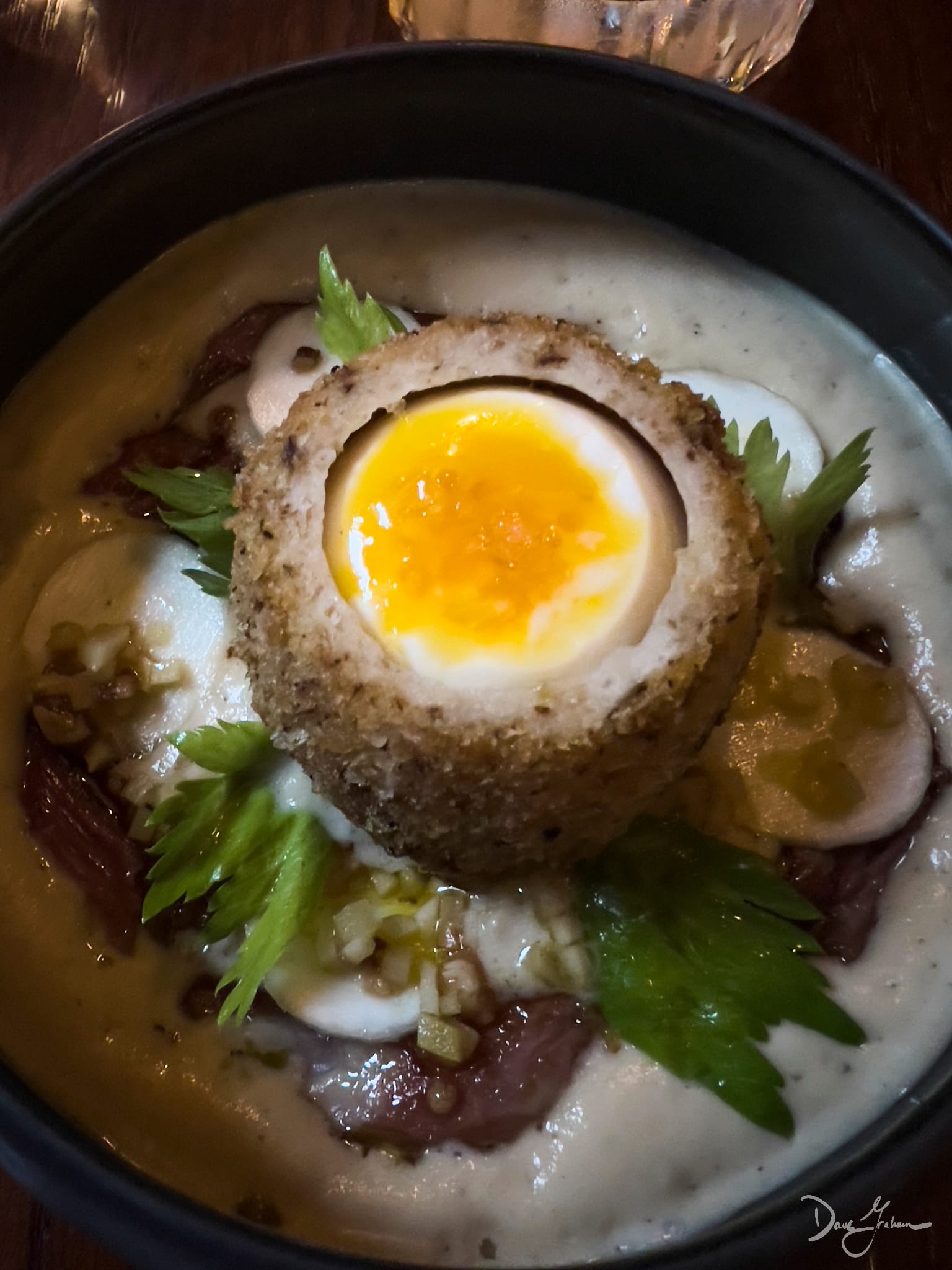 So, too, the pig that ruts through the dark earth and the hen that barely scratches the surface find their way to our story. Here lies the tale of our care and consideration, our custodial relationship with those incarnated spirits we call “animals” that are our charges. From the richness of a hen’s egg, yolk slightly firm, wrapped in a garment of crumb and gentle spice, to the celeriac bath that envelopes the salty ham hock and the sharpness of a radish, we find ourselves double-blessed for the barns and boards, the poetry of warmth and invitation found here.