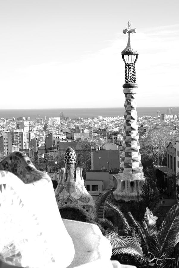 I’m intentionally taking these photos in black and white because this promotes a richer understanding of the Parc. It’s certainly colourful, with the tiles and mosaics assembled in riotous arrangements designed to beckon you down the rabbit hole. But it’s more than just the colour; the visceral expression of the curves, shapes, windows, ledges, and the view from above the city grabs your heart.